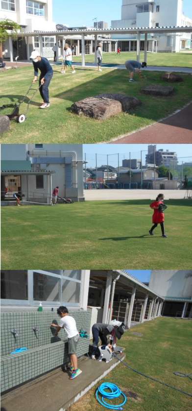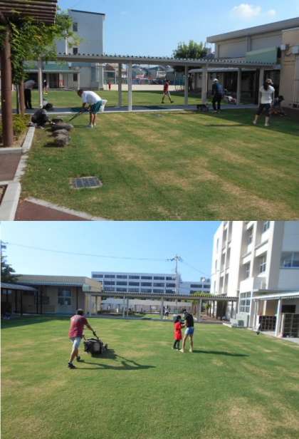 芝生化実行委員会の方々が土曜日の朝早くから、芝生広場とナッケ広場の芝生のお世話をしていただいています。芝刈り機やはさみで長く伸びた芝を刈ったり、新しい種や肥料をまいたりと、作業をしていただいています。また、暑い日が続いているので水やりもしていただいています。