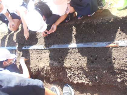 木曜日のふれあいタイムでは、6年生が他学年の人たちに植え方を教えることになります。指を広げて植える間隔を決めて目印の爪楊枝をさしました。そして、その周りに指で穴をあけて種を植えました。実際にやってみることで、本番のふれあいタイムで自信をもって1〜5年生に教えることができます。