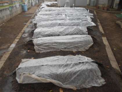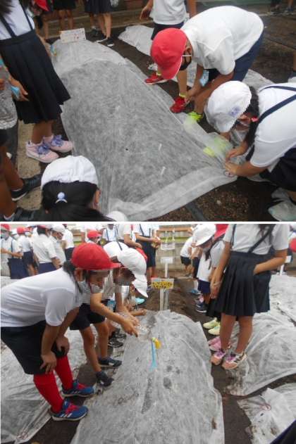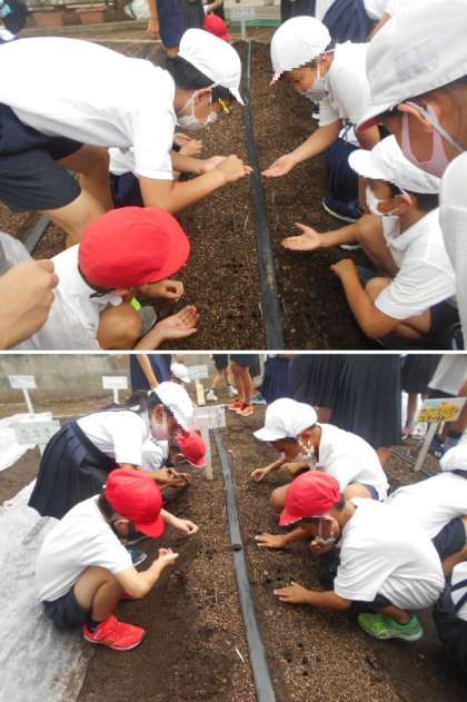 ふれあいタイムの時間に「田辺大根」の種を植えました。田辺大根サポーターの方に教えていただいた6年のリーダーが、班のみんなにていねいに教えていました。みんな種と種との間隔を、自分の指を広げてはかって目印のネームプレートをたてました。そして、その目印を中心に5粒ずつ種をうえました。最後に不織布をかけて水をしっかりとあげました。