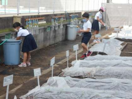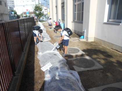 火曜日は3年生、水曜日は4年生が担当です。朝からたくさんの人が農園に来て水やりをしていました。南側の新しい畑にも忘れずに水やりをしていました。もう立派な芽が出てきています。上にかぶせた不織布をとるのが楽しみですね。