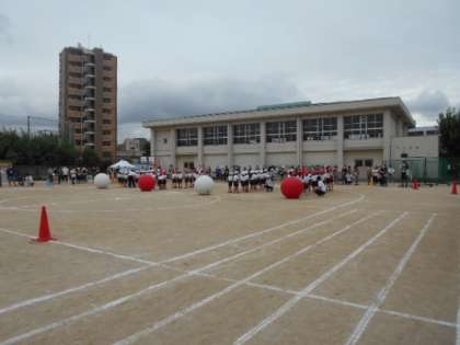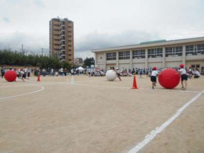 2年生の団体競技は、大玉転がしです。自分たちの背丈くらいの大玉を協力してリレーしていきます。コーンの回り方が勝負を左右します。