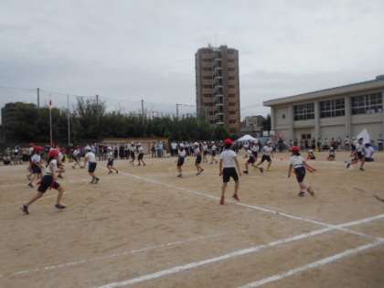 6年生は騎馬戦ができないので、「源平合戦長池の陣」という新しい競技をすることになりました。腰に付けたタグを取られないように相手陣地にトライをします。スピードとタイミングが勝敗を分けます。