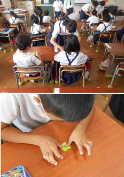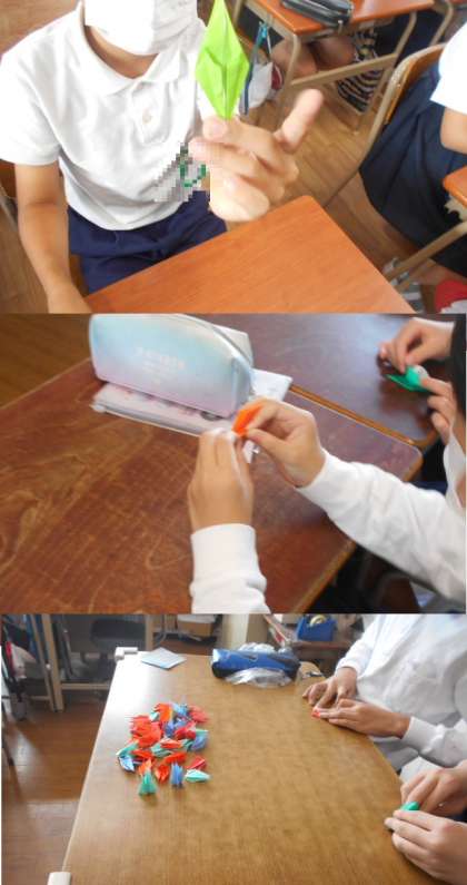 どの学級も6年生に教えてもらいながら一つ一つていねいに折っていました。低学年の人たちは説明を聞いても少し難しいかったようですが、6年生が個別に教えてくれて、一生懸命に折っていました。さすがに高学年は毎年しているのでたくさん折って集めていました。