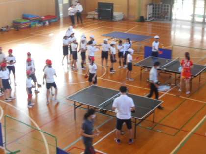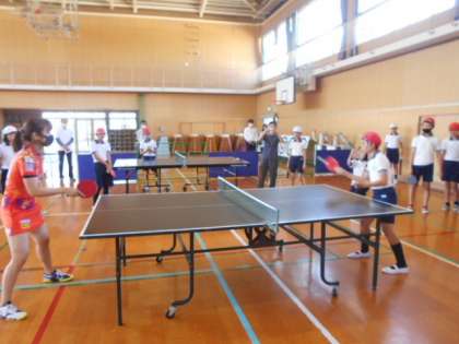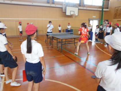 選手の方やコーチの方に球出しをしてもらってどんどん打ち返す練習をさせていただきました。卓球以外にもいろいろな質問にも答えていただく時間もありました。「楽しかった。」「よくわかった」など子どもたちは満足そうな笑顔でした。日本ペイントマレッツの皆様ありがとうございました。