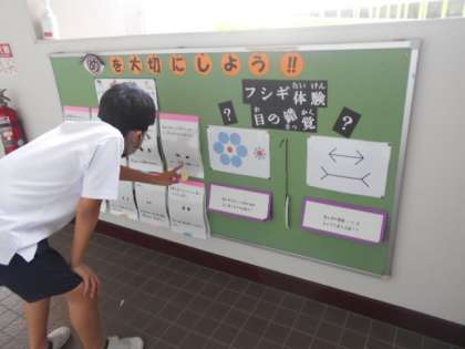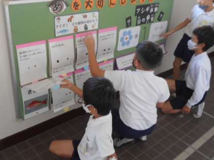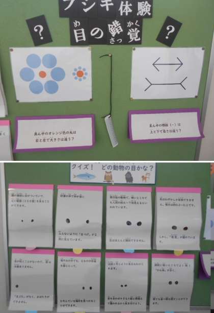 保健室前の掲示物がかわりました。今回は「目を大切にしよう」というテーマです。目の錯覚クイズは分かっていても長さや大きさが違って見えてしまいます。また、いろいろな動物の目のクイズは、それぞれの動物の特徴がよくわかります。子どもたちは興味津々でクイズに取り組んでいました。
