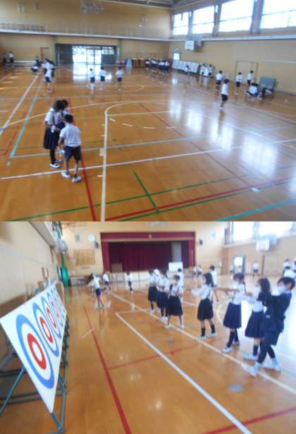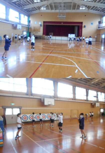 広い体育館で、的に向かって飛ばしたり、友だちと合わせて飛ばしたりしました。とじこめた空気に力を加えたときの空気の性質について学習できました。