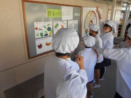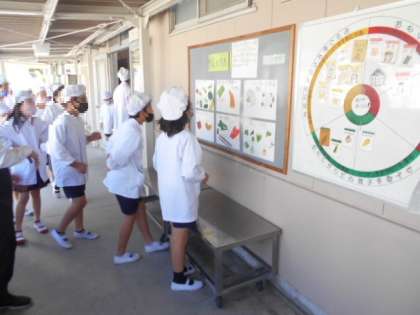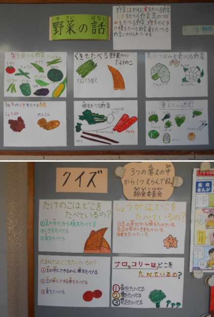 給食室前の掲示物がかわりました。給食委員会の人たちが、野菜のどこを食べているのかを調べました。その野菜のどの部分を食べているのか普段はあまり考えたことがないですね。中には花の部分を食べるものもありました。給食を運ぶときに掲示物を見ている人がたくさんいました。