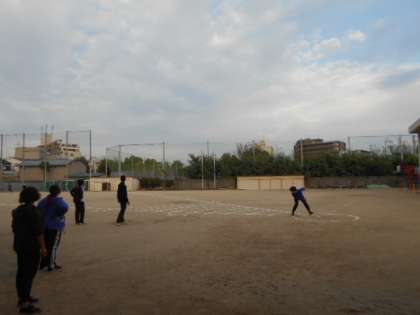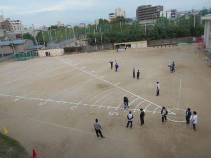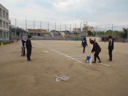明日ソフトボール投げのテストをします。1時間目から実施するので今日の放課後に準備をしました。運動場にラインを引きますが、なかなか円く線を引くのが難しいです。引き終わった後に、何人かの先生が「試し投げ」をしていました。結果はどうだったでしょうか?