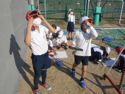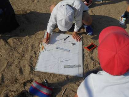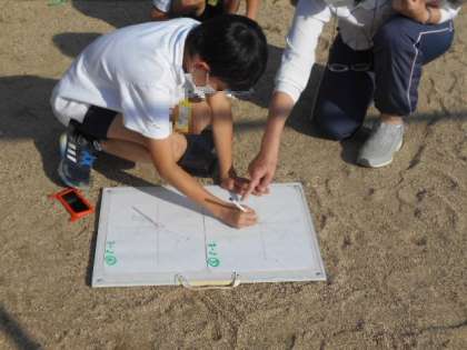 休み時間ごとに交代で観察しました。午後になって記録用紙にどんどん書き込まれていくと、太陽と影の関係が分かりやすくなりました。