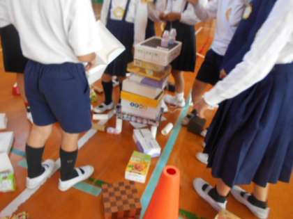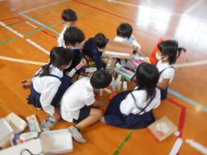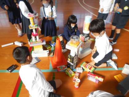 1年生は、図画工作科でたくさんの箱を使って、いろいろな物を作る学習をしました。グループで「塔を作ろう」「お城がいい」「キリンみたいに高い動物」など楽しい作品を考えて作っていました。