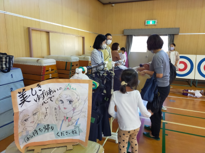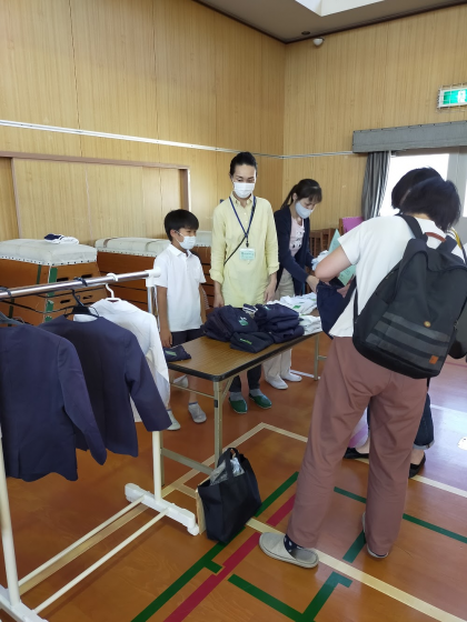 就学前健診の日に合わせて、体育館にて奨励服リユースを行いました。