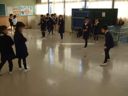 先日1年生が、地域の方々にゲストティーチャ—として来ていただいて、「昔あそび」を教えていただきましたが、今度は自分たちが、地域の幼稚園や保育園のお友だちに教えることができるように練習しています。「昔あそび」の練習コーナーを回って、教えていただいたことを思い出しながら意欲的に頑張っています。どれくらい上手になるのか、今からとても楽しみです。