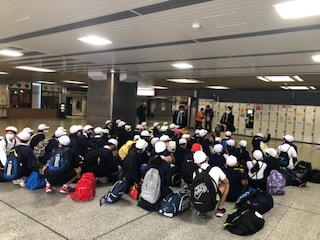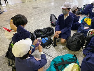 道路が空いていて予定よりも早く新大阪駅につきました。他の小学生もたくさん来ています。出発までまだまだ時間があるのでゆっくり休む、友だちと楽しく過ごす、それぞれの時間を過ごしています。バスから芸人さんに会いました。みんなのテンションもあがりました。