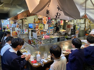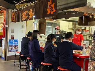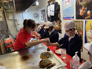 朝ごはんが早くお腹ペコペコ。お店の人にお好み焼きの食べ方を教えてもらっている人もいました。美味しくてすぐに食べ終わりました。