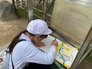 記念公園のアオギリの木の前で平和を祈るメッセージを書きました。
