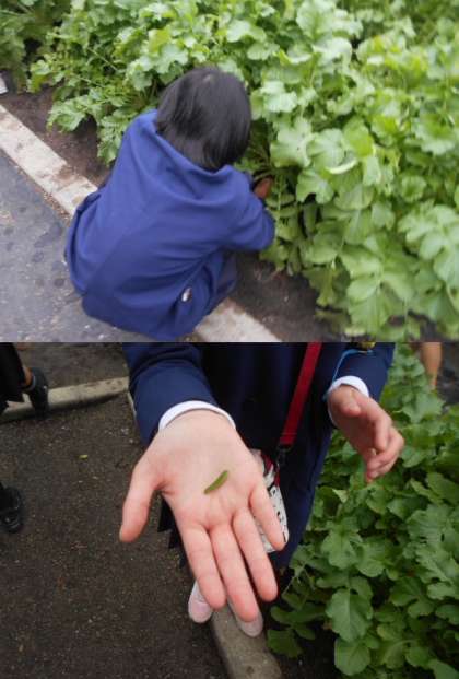 寒くなってきましたが水やりの当番になっている学年の児童は、忘れずに学校に来ると農園に来てお世話をしています。虫を怖がる人も多いですが、「気持ちいい」と青虫を手に乗せている人もいます。