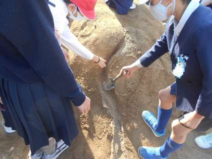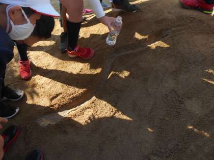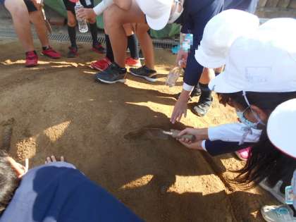 5年生が「流れる水のはたらき」の実験をしました。運動場にある土山にくねくね曲がった溝を作って、小さな川を作りました。そこに実際にペットボトルで水を流して「浸食」・「運搬」・「堆積」の学習をします。