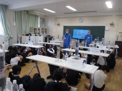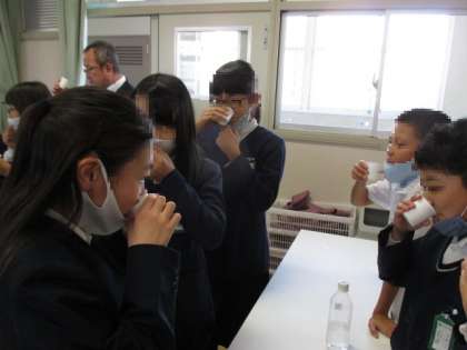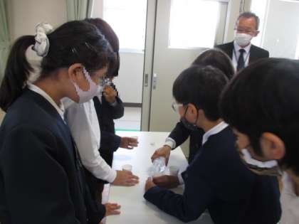 実験の後、水道水と天然水の利き水をしました。水道水がおいしいと答えた人もいました。
