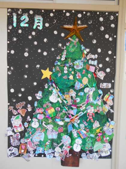 今月の掲示は1年の作品です。1年生がみんなで協力して作りました。クリスマスツリーにかわいい作品がかざられています。土台のもみの木もポスターカラーを初めて使って作りました。「おもしろい」「色が変わっていって楽しい」などの子どもたちの感想がありました。