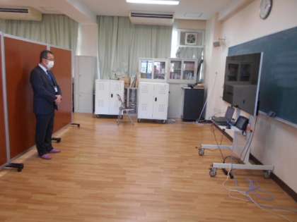 2学期の終業式は、多目的室からリモートで実施しました。校長先生・生活指導担当の先生から、2学期の主な出来事や冬休みに気を付けることなどの話を聞きました。