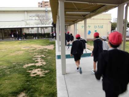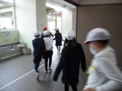 毎年3学期の始業式の時に、地震・津波を想定した避難訓練をしています。まず、地震が発生したときには、机の下にもぐって身の安全を守りました。揺れが収まると第1次避難として運動場へ急いで避難しますが、今日は雨だったので体育館に集まりました。