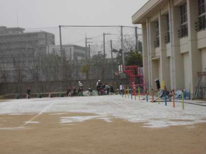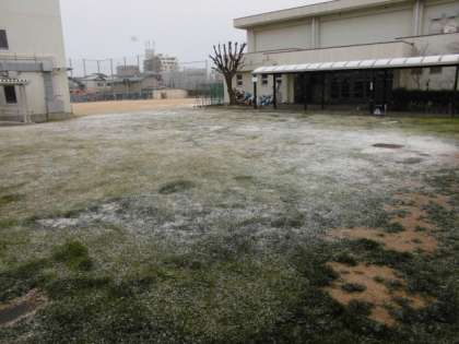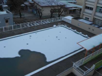 昼から大阪にしては珍しいくらいの雪が降りました。運動場にも少し積もっていたので、外で雪遊びをする学年もありました。また、プールの氷の上にはきれいに雪が積もっていて、廊下から見つけた人が「みんなプール見て!」と叫んでいました。