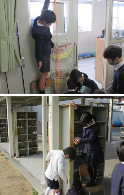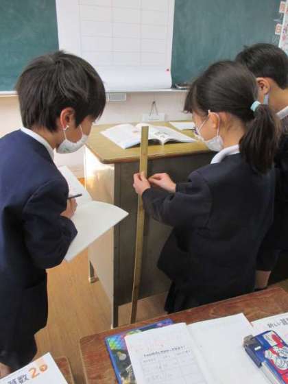 算数科の「長いものの長さのたんい」のまとめの学習として、身の回りにあるものを1mの竹尺で測りました。1mよりも大きいものは、子どもたちが3mの紙テープに目盛りをつけ、オリジナルの紙テープものさしを作り、測る活動をしました。班で協力して、ロッカーや本棚の長さなどいろいろなものを測りました。