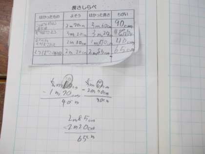 測った後は、予想と実際の長さのちがいを計算するなど、みんな一生懸命取り組んでいました。