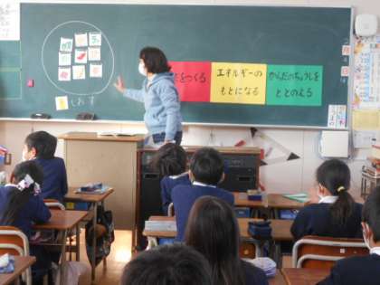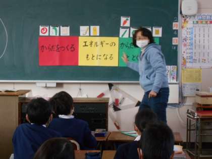 栄養教諭が8時45分頃から10分程度、各学級で栄養指導をしています。今日は、2年生で1年の国語の本にある「サラダでげんき」のサラダの栄養はどうなのかを考える学習をしました。お話を読みながらサラダに入っている食品カードを黒板にはり、それを3色の栄養に分けました。バランスよく食べることが大切であることを確認し、最後にみんなで食品を英語で言いました。