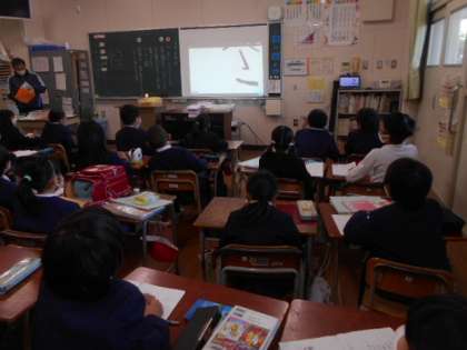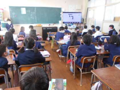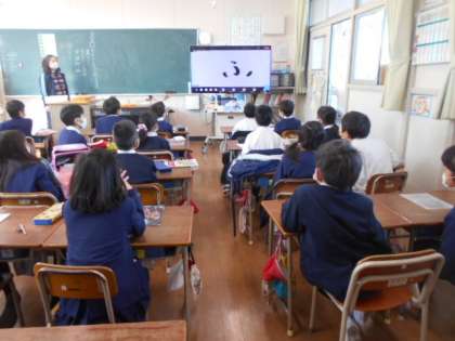 初めてのクイズでみんな画面に集中していました。問題が出されるたびに「な」「か」と答えたり、文字の置き方が「人の顔みたい」とか話したりして楽しく活動していました。