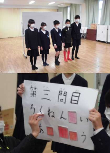 今日の児童集会は、リモートで「文字かくしクイズ」でした。ある言葉の何文字か隠されていて、その言葉を考えて答えるクイズです。10秒たったら1文字ずつめくってヒントが増えていきます。教室で見ている人たちは楽しく答えていました。