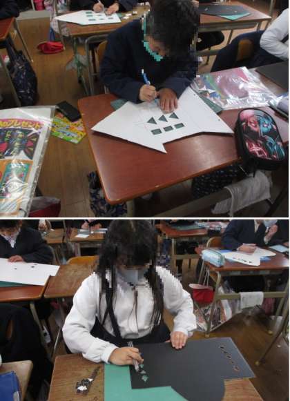 図画工作科の「ひかりのプレゼント」で、カッターナイフを使って、家の窓や魚の模様などを切っています。子どもたちは2年生になり、2回目のカッターナイフなので、慣れてきた様子で切っていました。