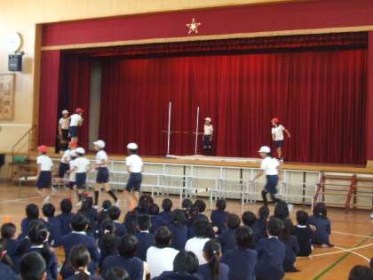 後半は、一輪車クラブ・陸上クラブの発表がありました。一輪車クラブは、みんなで手をつないで回ったり、交差したりする技を披露していました。陸上クラブは、体育館の狭いスペースを有効に使ってハードル・リレー・走り高跳びなどを発表しました。どのクラブも短い時間でしたが低学年にも分かりやすく発表し、「来年はぜひ入ってください」とアピールしていました。