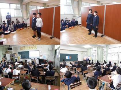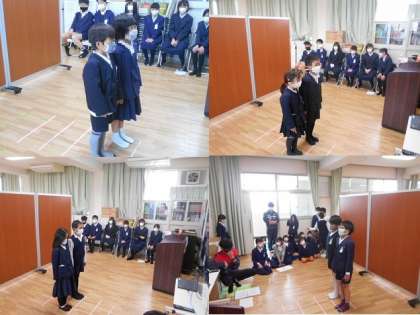 各学年の代表から卒業生に「お祝いの言葉」がありました。いろいろ教えてもらったり、やさしく接してくれたりしたことへの感謝のことばでした。続いて6年生から「お別れのことば」がありました。自分の学年の代表の児童が画面に出ると、とてもうれしそうでした。