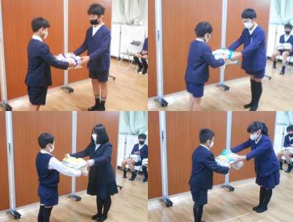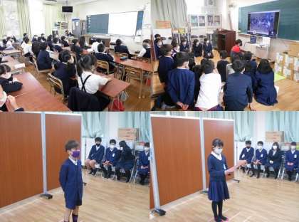 6年生から各学年へぞうきんのプレゼントがありました。また、先日この会のために録画した合奏のビデオを全教室で見ることが出来ました。多目的室の人たちもモニターの前に来て見ていました。リモートでの「卒業を祝う会」は初めてでしたが、児童会の人たちも各学年から参加した人たちも素晴らしかったです。思い出に残る「卒業を祝う会」になったことと思います。
