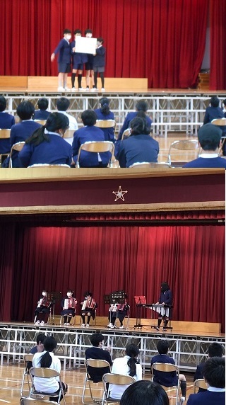 例年の「お別れ会」は多目的室でするのですが、今年度は密をさけて体育館で「お別れ会」をしました。グループで考えたクイズやゲーム・劇・コント・合奏などの楽しい出し物をしながら、卒業前の時間を過ごしました。
