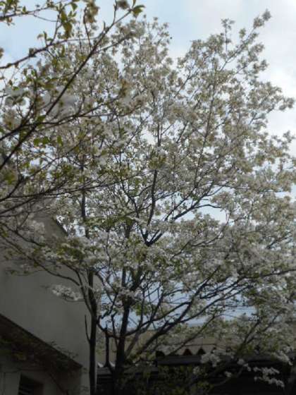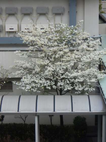 桜の花は散ってしまいましたが、講堂の入り口横のハナミズキが満開です。真っ白な花がいっぱいにひろがっています。