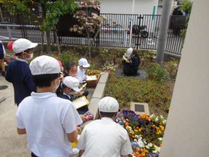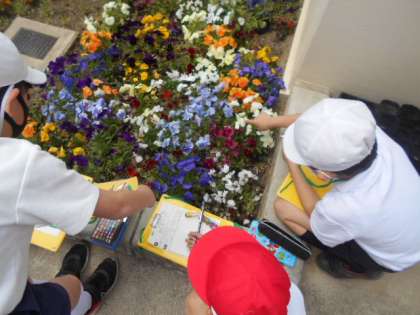 理科で「春の生き物の観察」を学習しています。学校の南側に咲いているきれいな花を観察しました。本校の管理作業員が冬の間から世話をしていて、春になってたくさんの花が咲くようになっています。