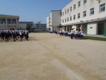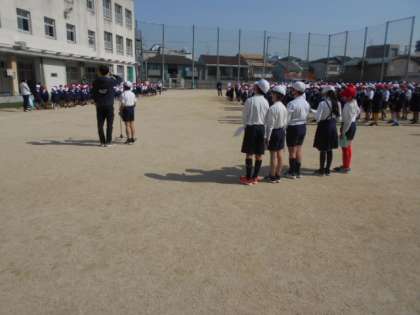 「1年生を迎える会」が20日(火)にありました。雨天のため2回延期になっていましたが、今日は晴天の中で実施することができました。例年は講堂で行うのですが、コロナ禍の中なので今年度は運動場で実施しました。