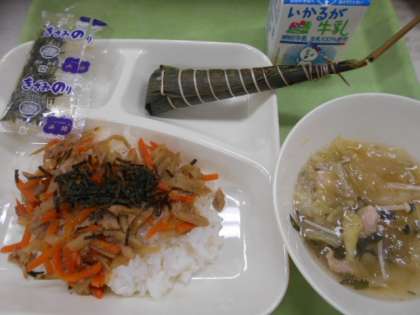 今日はこどもの日の行事献立で「きんぴらちらし、すまし汁、ちまき、牛乳」でした。