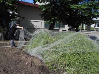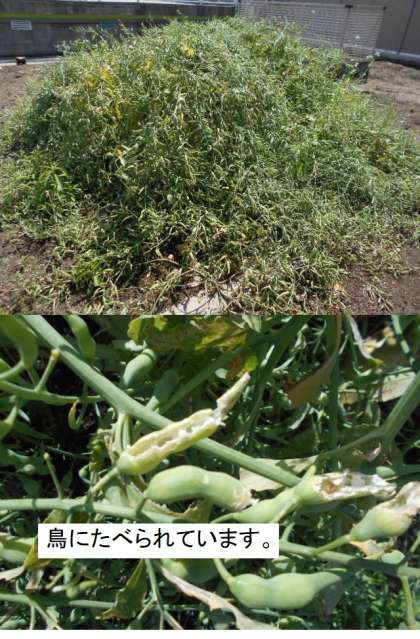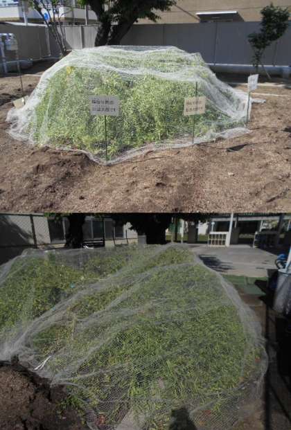 この畑で採れた田辺大根の種が、2学期に植える種になります。例年と場所が違うのですが、鳥たちはよく分かっているようで、そろそろ色が付き始めてきた種の近くを飛び回っています。もうすでに食べられているものもあります。種取り用の田辺大根の畑にネットをかけました。乾燥して色が茶色になるまでこのネットが種を守ります。長池小学校の田辺大根の栽培は1年間続いています。