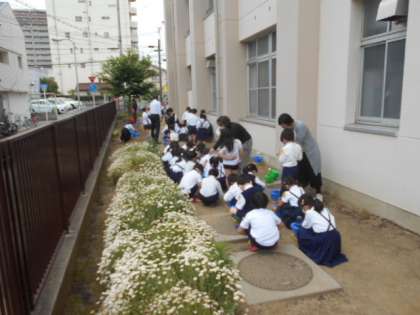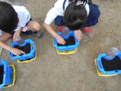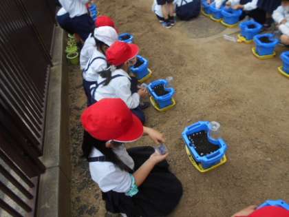 1年生は、生活科の学習でアサガオを種から育てます。鉢に土を入れてから種を植えました。白い固形の肥料もあげました。
