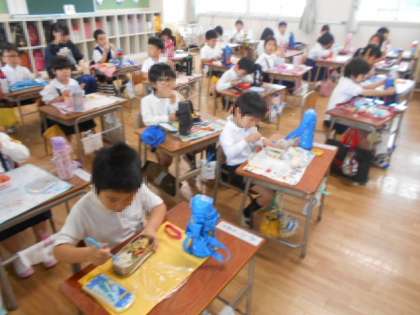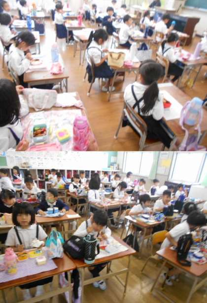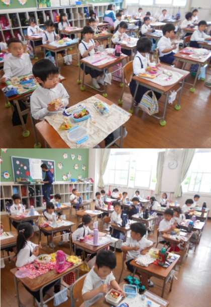通常であれば5月12日は、1・2年生の遠足の日でした。「緊急事態宣言」が継続され、残念ですが校外での活動ができなくなっています。給食の実施が困難なことから、お弁当を持ってきて教室で食べることになりました。