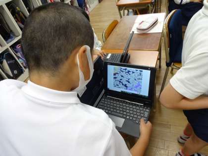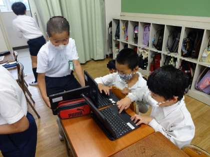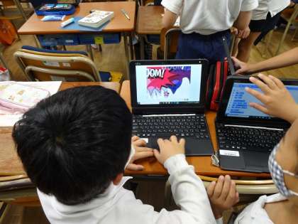 休み時間にタブレットで、プログラミング教材「スクラッチ」に挑戦している子もいます。音を出したり背景を変えたりしています。得意な子にやり方を聞いて、挑戦している子もいます。