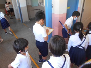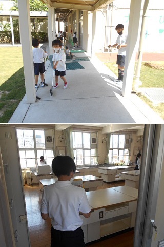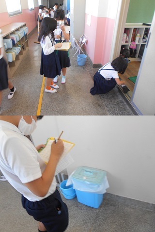 通常授業が始まって、いつもと同じように清掃の時間が確保できるようになりました。0のつく日に環境委員会が「ゴミ0の日」を設定しています。「もくもく すみずみ きびきび と掃除をしましょう。」と放送で呼びかけをしました。そして、各教室や特別教室などを回って、清掃中の様子や後片付けなどができているか確認していました。