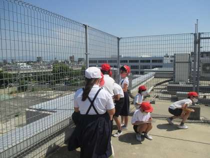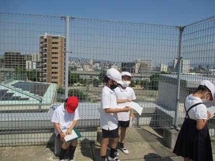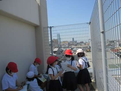 社会科で学校の周りの目じるしになるものを見つけに屋上に行きました。北はハルカス、東はJRやシャープ公園、南は長居公園というように校区の様子がよくわかりました。