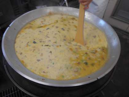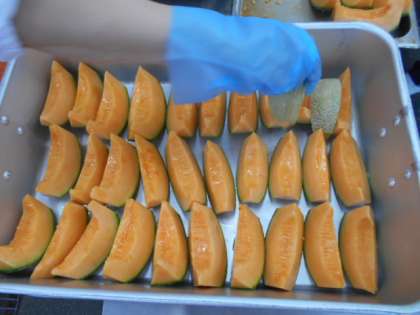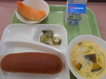 今日は「かぼちゃのクリームシチュー、ミックス海そうのサラダ、クインシーメロン、黒糖パン、牛乳」でした。かぼちゃのクリームシチューは、旬のかぼちゃを使い、ルウは、手づくりしています。ミックス海そうのサラダは、ゆでたミックス海そうと焼き物機でむしたキャベツ・きゅうりを合わせ、砂糖、塩、米酢、うすくちしょうゆ、綿実油で作ったドレッシングで和えています。クインシーメロンは1個を8等分し、種をとりました。