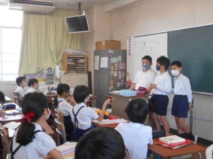健康委員会が毎月の初めに保健しらべをしています。「ハンカチを持っていますか?」「歯みがきをしましたか?」とみんなにたずねます。「今日できなかったことを、明日は忘れないようにしましょう。今日も一日元気にすごしてください。」と呼びかけていました。