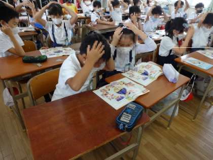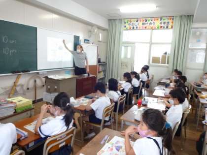 「What time is it?」と英語で時間を尋ねる練習をしています。子どもたちは外国語活動の学習をいつも楽しみにしています。