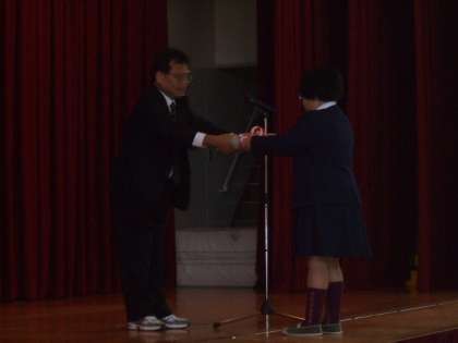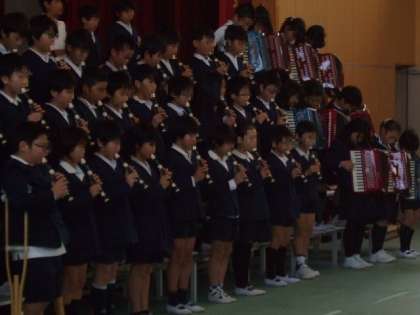 24日(火)に26年度の修了式が行われました。5年生の代表の児童に校長先生から修了証書が渡されました。その後、1年生と5年生が発表をしました。1年生は頑張ったことを発表してから「さんぽ」の歌をみんなで大きな声で歌いました。5年生は、「キリマンジャロ」の合奏の後、「大空が迎える朝」を児童のピアノ伴奏で歌いました。
